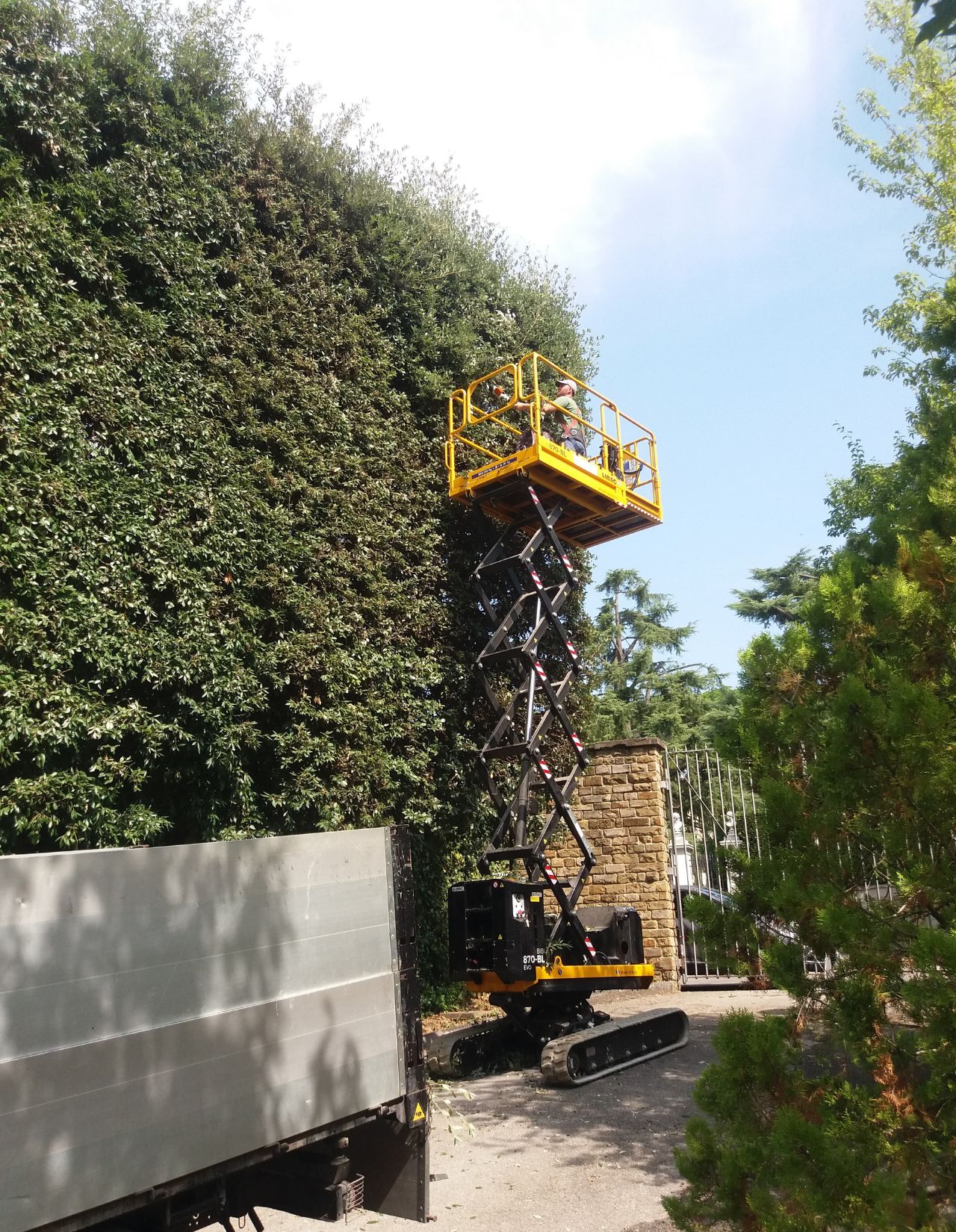 Le piattaforme aeree sono mezzi meccanici dotati di cestelli aerei, che permettono ai tecnici di agire dall’esterno della chioma. L’uso di piattaforme aeree è consigliato quando il terreno non garantisce la stabilità dell’albero in arrampicata, oppure se l’albero stesso si è appoggiato nel tempo ad altri alberi in cerca di equilibrio, o se i rami sono fragili o secchi.
